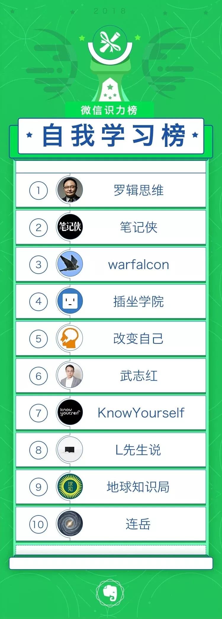 印象笔记发布的「2018年新媒体榜单」中,公众号「插坐学院」,获得「自我学习榜」第4名。