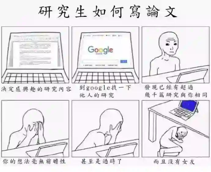 当你想到一个研究问题的时候,你很可能不是第一个想到的。 如果你没找到相关的研究,可能只是因为他人描述问题的形式和你不尽相同,更糟糕的是可能是因为你的问题根本不具备研究价值。无论哪种情况,都是由于文献调研还不够充分导致的。需要多读论文,然后通过交流讨论,确定这个研究问题能不能做下去。不要担心那些和你研究同一个问题的论文:创新性可以来自很多方面,新方法,新结论,新应用点,世界这么大,只要你会讲故事,没那么多论文能和你完全一样(真一样的话就说明是有缘人,发邮件交个朋友去吧)。前人的工作将为你提供很多宝贵的结论、经验、教训,也必然存在不完善的地方,沿着前人的不足做下去就好了。
