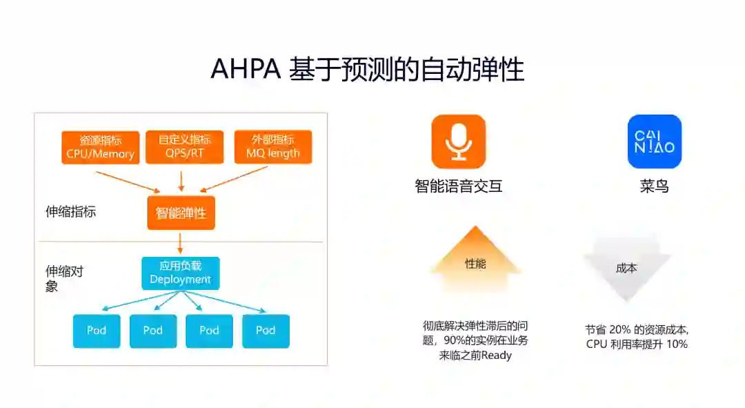 弹性是云最核心的能力之一,可以有效降低计算成本。ACK在资源层和应用层提供了丰富的弹性策略,在资源层,当集群资源不足时,ACK集群可以利用 cluster-autoscaler 在节点池中自动创建新的节点实例。我们可以根据应用负载,选择ECS虚拟机,神龙裸金属实例,进行扩容。基于阿里云强大的弹性计算能力,我们可以在分钟级实现千节点扩容。在ACK集群中一个更加简化的方案是利用ECI弹性容器实例来实现弹性。ECI基于轻量虚拟机提供了 Serverless 化的容器运行环境,具备强隔离、高弹性,免运维、免容量规划的特性。弹性容器实例可以在 30 秒内扩容 3000 Pod,可以轻松应对突发的新闻事件,或者支持自动驾驶模拟仿真这样的批量计算业务。值得一提的是,我们可以使用ECS或者ECI的竞价实例,它可以利用阿里云的空闲计算资源,成本折扣可以低至按量付费实例的 90%。竞价实例非常适合无状态和容错性好的应用,比如批量数据处理或者视频渲染等。在应用层,Kubernetes提供了HPA 的方式进行 Pod 的水平伸缩,和 VPA 进行 Pod 的垂直伸缩。ACK 内建了基于机器学习的AHPA方案、来进一步简化弹性体验,提升弹性的 SLA。K8s内建的水平 Pod 自动伸缩(HPA)有两个不足: 第一个是弹性的滞后性,弹性策略基于对监控指标的被动响应,此外由于应用本身启动、预热也需要一定时间,在扩容的过程中,业务稳定性可能会受到影响;第二个是配置的复杂性,HPA的运行效果取决于弹性阈值的配置。配置过于激进可能导致应用稳定性受影响,配置过于保守,成本优化的效果就大打折扣。需要反复尝试才能达到一个合理的水平。而且随着业务的变化,也会需要重新调整弹性策略。阿里云和达摩院团队合作,推出了AHPA,可以根据历史资源画像,对弹性周期和用量进行预测,提前扩容来保障服务质量,已经在菜鸟PAAS平台、阿里云智能语音服务多种场景经过验证。帮助智能语义交互产品实现90% 的实例在业务来临之前 Ready,CPU 利用率提升 10% 节省 20% 的资源成本。