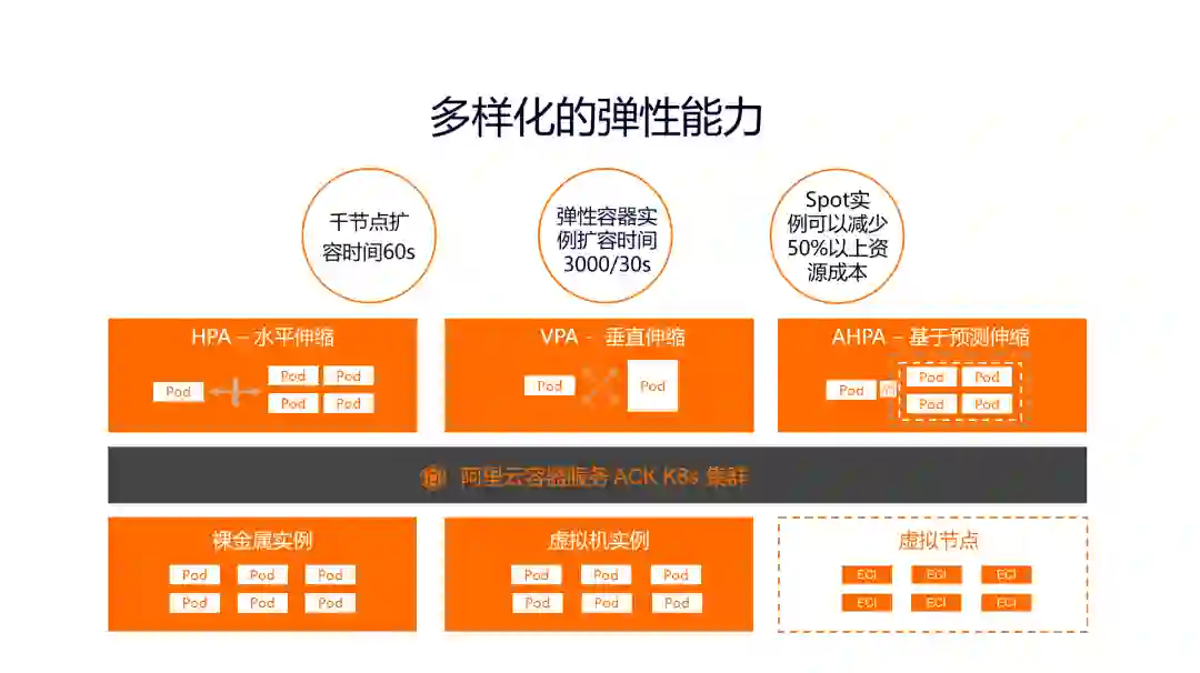 多样化弹性能力:弹性容器实例可以在 30 秒内扩容 3000 Pod
