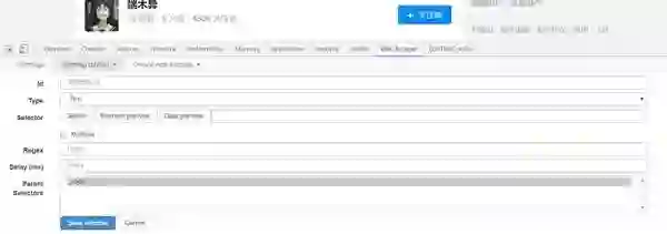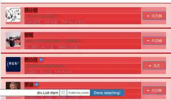 以抓取张佳玮关注对象为例,我们的范围就是张佳玮关注的对象,那就需要为这个范围创建一个选择器;而张佳玮关注的对象的粉丝数、文章数量等内容就是二级选择器的内容。 具体步骤如下: