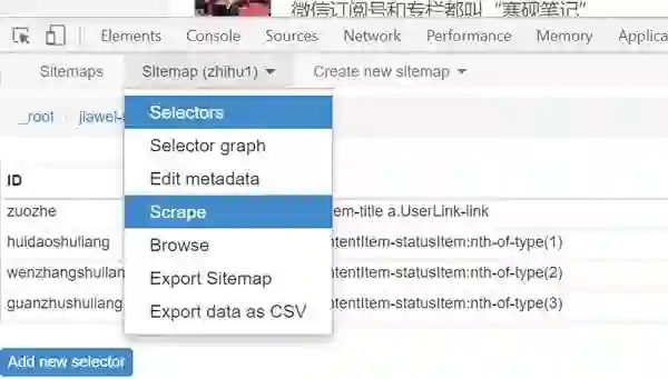接下来就是重中之重了。这里先介绍一下web scraper的抓取逻辑:需要设置一个一级选择器(selector),设定需要抓取的范围;在一级选择器下建立一个二级选择器(selector),设置需要抓取的元素和内容。