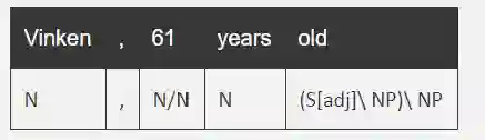 组合范畴语法(CCG; Steedman, 2000)是一种高度词汇化的形式主义。Clark 和 Curran 2007 年提出的标准解析模型使用了超过 400 个词汇语类(或超级标记(supertag)),典型的解析器通常只包含大约 50 个词性标注。