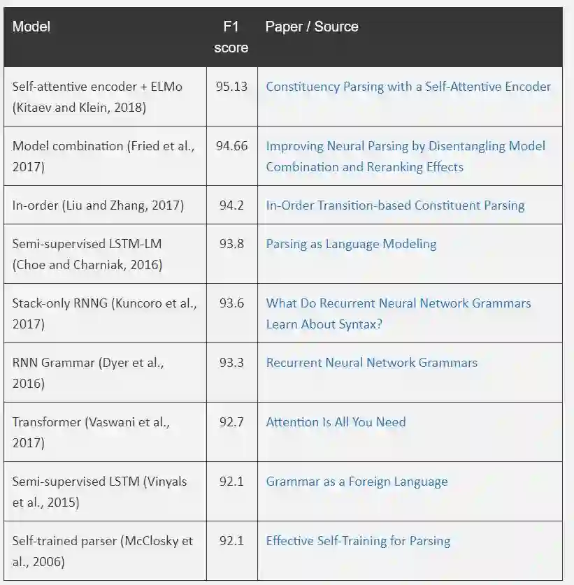 Penn Treebank 的「Wall Street Journal」部分用于评估选区解析器。第 22 部分用于开发,第 23 部分用于评估。模型基于 F1 评估。以下大多数模型整合了外部数据或特征。要对比仅在 WSJ 上训练的单个模型,参见《Constituency Parsing with a Self-Attentive Encoder》。