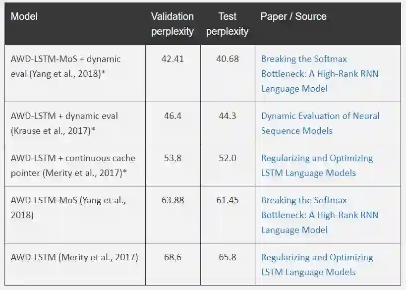 语言建模是预测文本中下一个词的任务。*表示模型使用了动态评估。