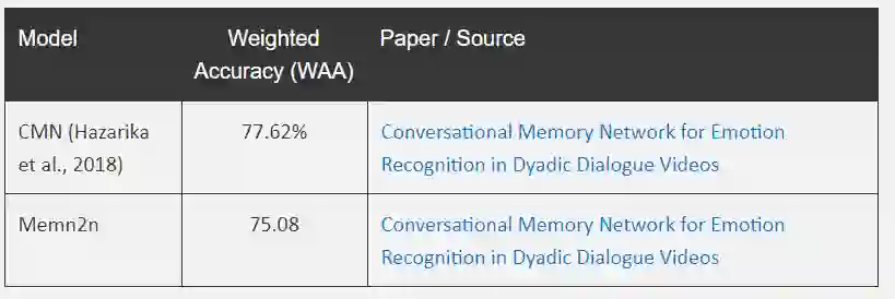 IEMOCAP(Busso等人,2008年)包含了10个说话者的行为,他们的双向对话被分割成话语。所有视频中对话的媒介都是英语。该数据库包含以下分类标签:愤怒、快乐、悲伤、中性、兴奋、沮丧、恐惧、惊讶等等