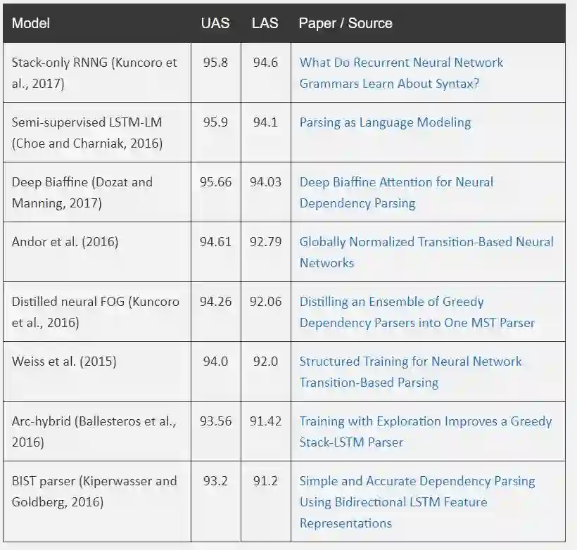 模型在《Stanford typed dependencies manual》中提出的 Penn Treebank 的 Stanford Dependency 变换和预测词类标记上进行评估。评估指标是未标记依附分数(unlabeled attachment score,UAS)和标记依附分数(LAS)。