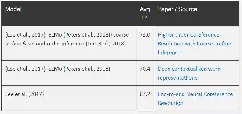 实验是构建在《CoNLL-2012 shared task》的数据集之上的,其使用了 OntoNotes 的共指标注。论文使用官方 CoNLL-2012 评估脚本报告了精度、召回率和 MUC 的 F1、B3 以及 CEAFφ4 指标。主要的评估指标是三个指标的平均 F1。