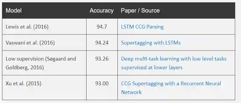 CCGBank 是 CCG 衍生物的语料库,以及从 Hockenmaier 和 Steedman 2007 年提出的 Penn Treebank 中提取的依存结构。第 2-21 部分用于训练,第 00 部分用于开发,第 23 部分用作域内测试集。其性能仅在 425 个最常用的标签上计算。模型基于准确率来评估。