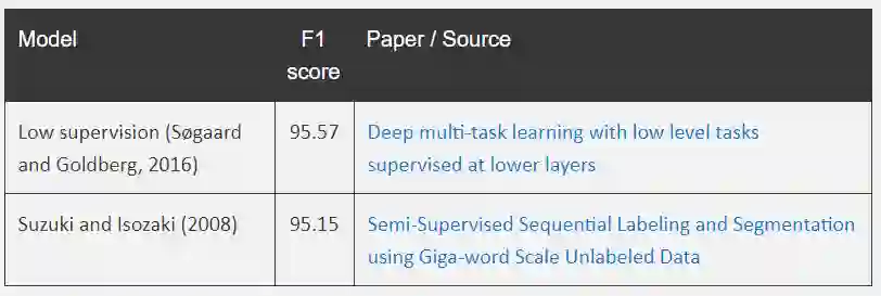 用于词性标注的标准数据集是华尔街日报(WSJ)分配的 Penn Treebank,它包含 45 个不同的词性标签。其中 0-18 用于训练、19-21 用于验证其它 22-24 用于测试。模型一般都通过准确率进行评估。