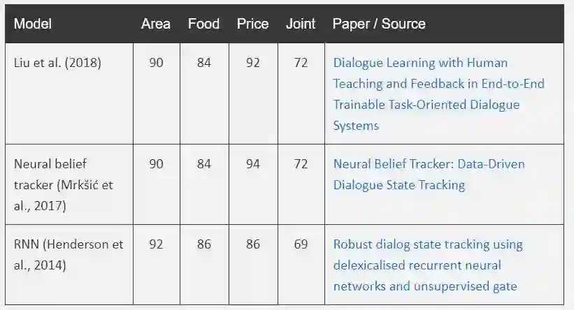 对于目标导向的对话,第二对话状态追踪挑战赛(Second dialog state tracking challenge,DSTSC2)的数据集是一个常用的评估数据集。对话状态追踪涉及确定在对话的每个回合用户在当前对话点的目标的完整表征,其包含了一个目标约束、一系列请求机会(requested slot)和用户的对话行为。DSTC2 聚焦于餐厅搜索领域。模型基于单独的和联合的机会追踪的准确率进行评估。