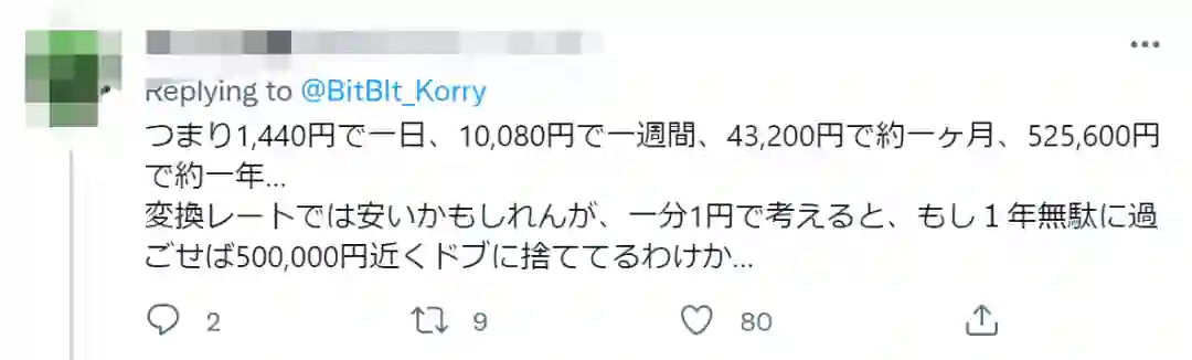 还有人表示,如果按照这个价格来算,一天1,440日元,一周10,080日元,一个月43,200日元,一年525,600日元。也就是说,