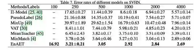 在SVHN任务下,EnAET在经典250有标注样本下将错误率从3.78%进一步降到3.21%,具体对比如下: