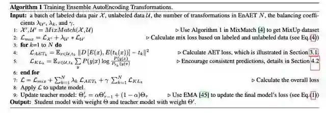 可以看出,因为EnAET是一种全新的基于图像变换的训练思路,所以针对任何以前的半监督算法,都可以将EnAET作为一种类似于正则化的方法引入训练,因此简而言之,针对任何半监督算法, EnAET可表述为: