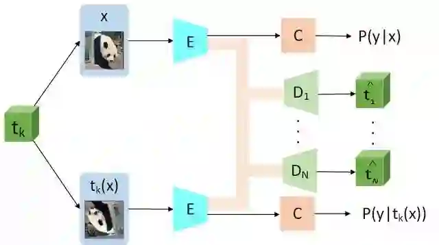简而言之,针对半监督中的分类网络,将其划分为两部分:编码器E和分类器C。同时针对不同变换tk提供不同的解码器Dk ,这里所有Dk的网络结构和C保持一致。对于不同变换后的图片和原图,E和C始终共享权重,这样做的原因是希望每种变换都能利用原图和变换后的图片经过E编码的特征预测,从而实现加强E表现性能同时避免过拟合的目标。