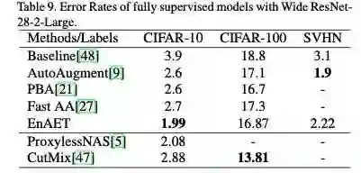 基于模型1,与所有基于该模型的全监督方法进行了对比,其中包括基于数据增强策略搜索的AutoAugment的方法,EnAET模型均取得显著提升,具体对比如图8所示。