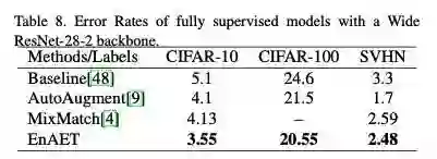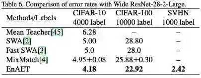 基于模型2,考虑到其他方法没有用过EnAET中的网络结构,因而采用Wide Resnet-28-10结构作为baseline。相比于我们的模型,该模型结构更加复杂并且拥有更多的参数,因此这种比较是公平的。同时对于不同数据集引入了全监督SOTA方法作为对比。