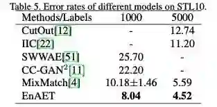 在STL10任务下,EnAET在1000标注样本下将错误率从10.18%下降到8.04%,在使用所有标注样本情况下将错误率从5.59%降到4.52%。