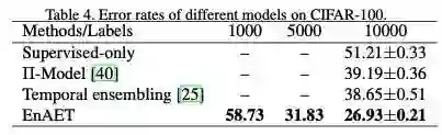 在CIFAR-100上,EnAET首次实验了每类仅有十张图片的情况,取得了58.73的错误率。在经典的10000张有标注图片分类任务下,成功将错误率从38.65%降到了26.93%。具体对比如下: