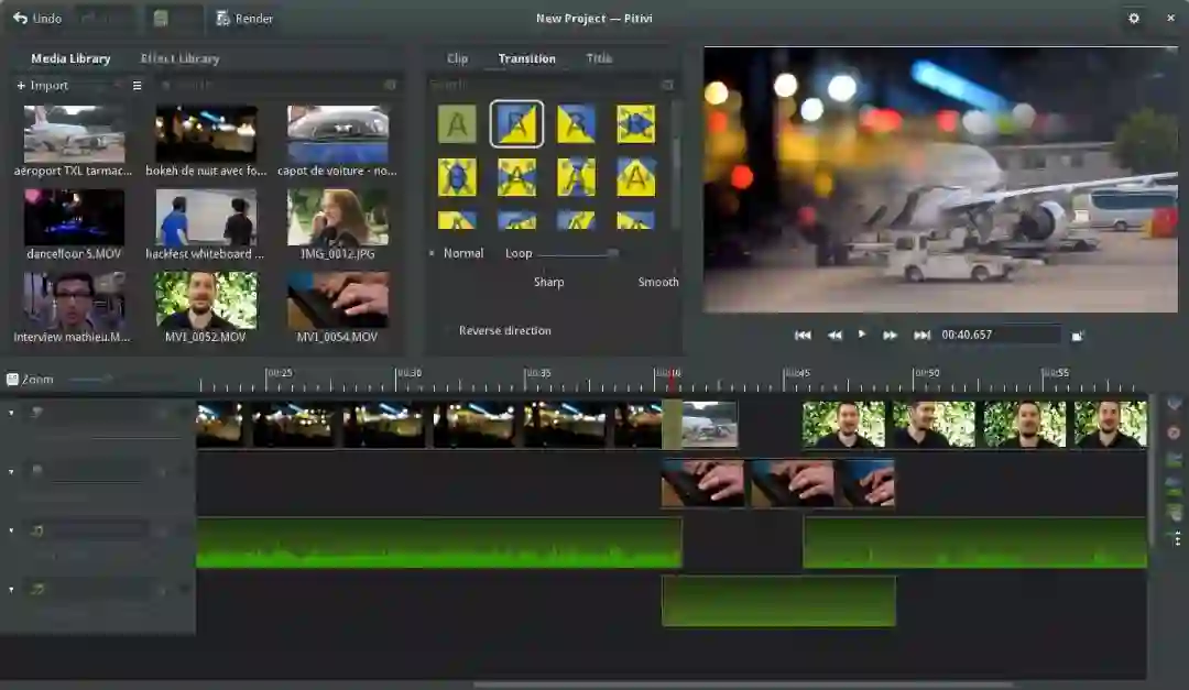 Pitivi 内置了多种工具,可以快速有效地编辑剪辑。只需将视频、音频和图像导入 Pitivi 媒体库,然后将它们拖到时间线上即可。此外,除了时间线上的简单淡入淡出过渡之外,Pitivi 还允许你轻松地将剪辑的各个部分分割、修剪和分组。