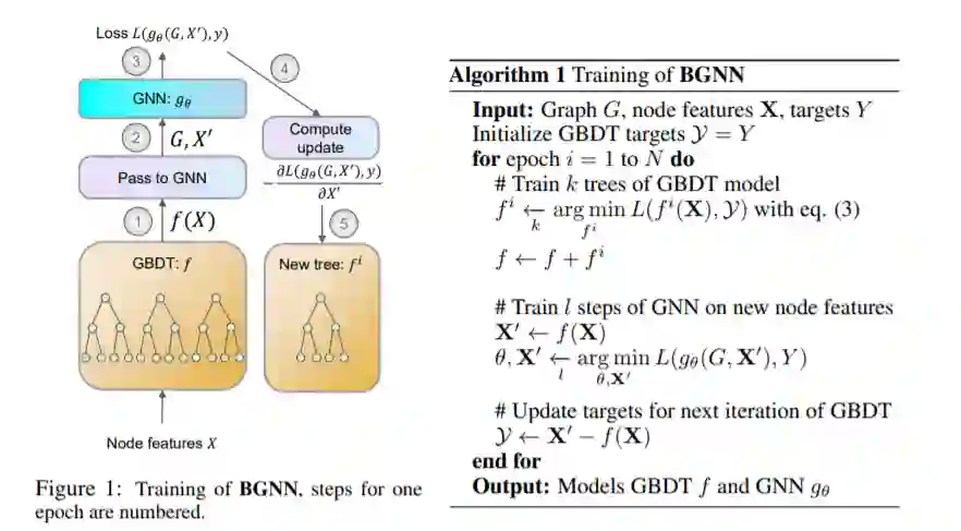 BGNN(GBDT和GNN进行端到端培训)的训练如下图1所示,在算法1中,介绍了结合GBDT和GNN的BGNN模型的训练,以解决任何节点级预测问题。