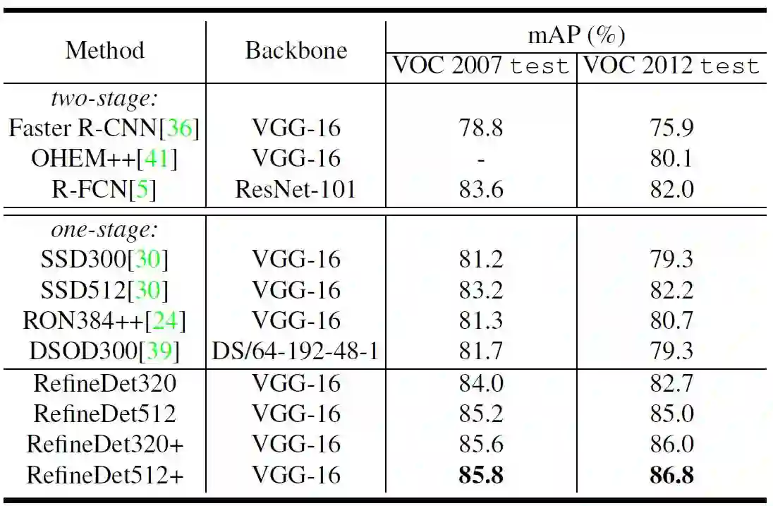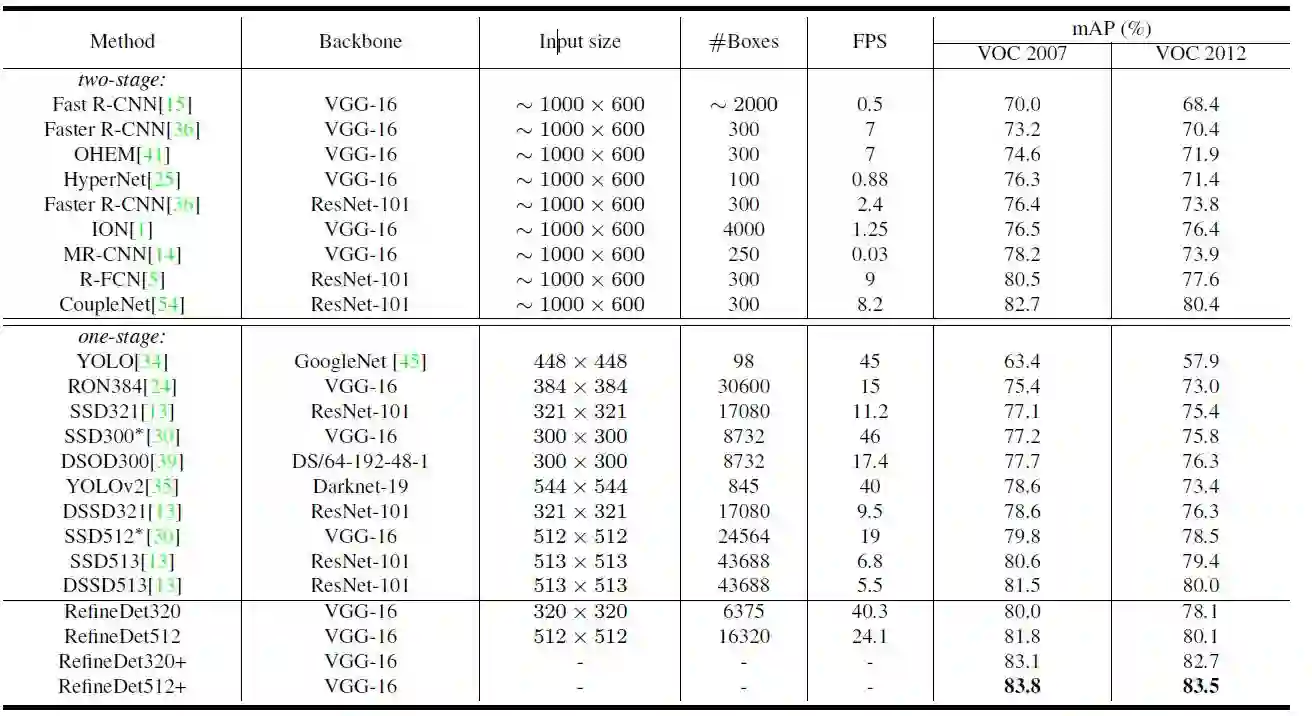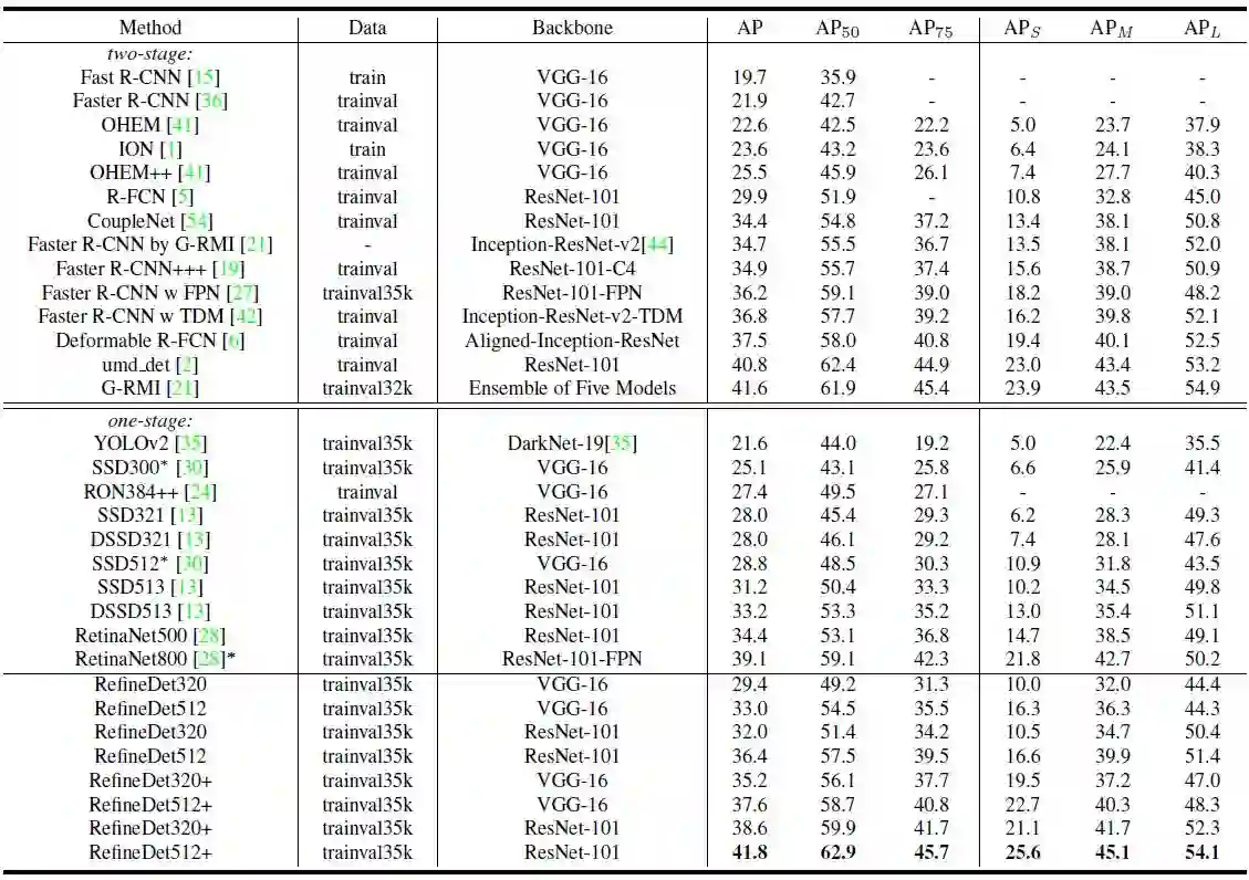 在PASCAL VOC 2007,PASCAL VOC 2012和MS COCO基准数据集的大量实验表明,RefineDet优于最先进的方法。具体来说,在VGG-16网络上,VOC 2007和2012的mAP达到85.8%和86.8%。 同时,它胜过了之前公布的单阶段和两阶段方法的最好结果,采用ResNet-101在MS COCO test-dev上实现41.8%AP的。 另外,RefineDet的时间效率高,当输入尺寸为320×320和512×512时,在NVIDIA Titan X GPU上的运行速度为40.2 FPS和24.1 FPS。
