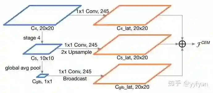 ThunderNet是做ARM上实时的目标检测算法,主要简化了FPN结构,只使用C4/C5,同时引入gpooling操作(Face++论文好多这么用,确实有效),最终输出C4分辨率大小的累加特征。