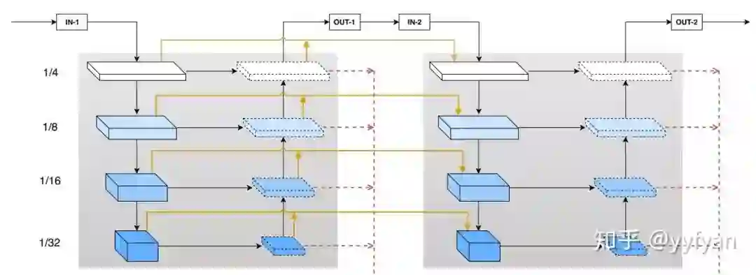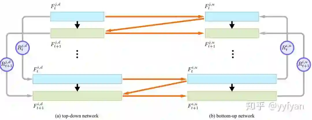ZigZagNet在PANet上进行改进,使得top-down和bottom-up之间进行交互,同时使top-down和bottom-up的每一层之间也进行信息交互。这样就完成了双方向上的多尺度上下文信息加强。