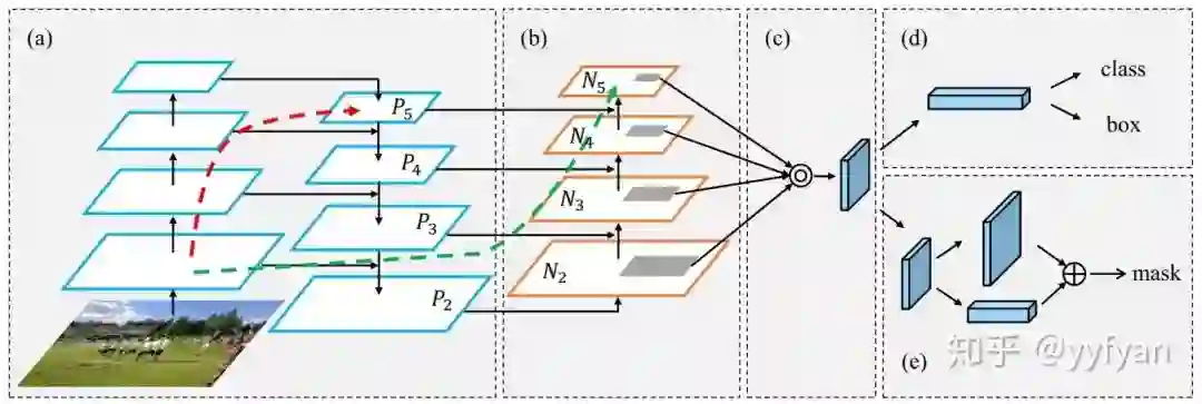 PANet在FPN的基础上加入bottom-up结构有效地传播P2的定位信息到其他层,结构与top-down结构基本一致。