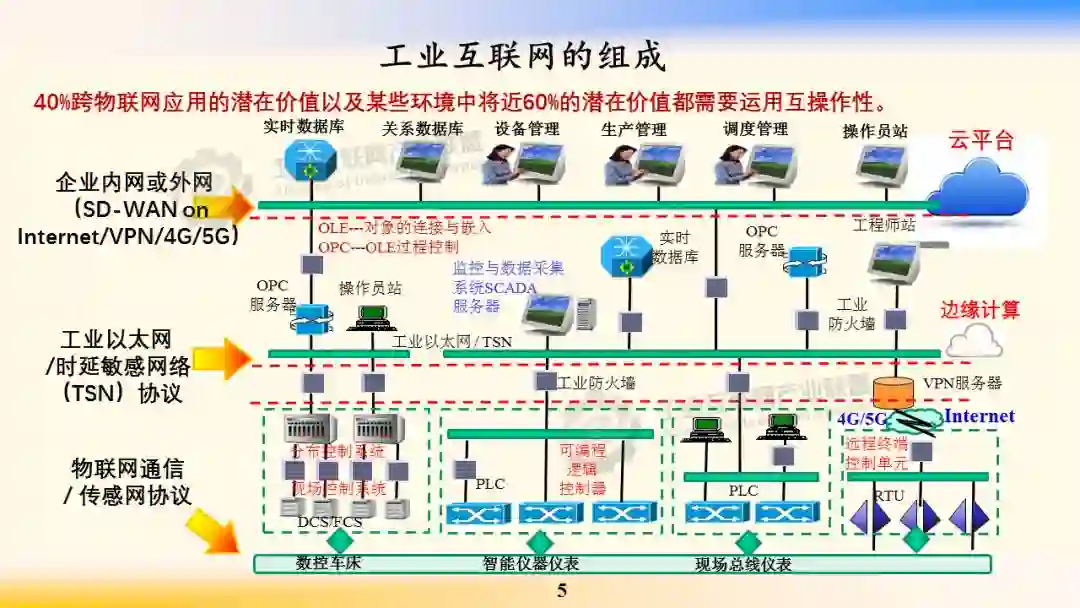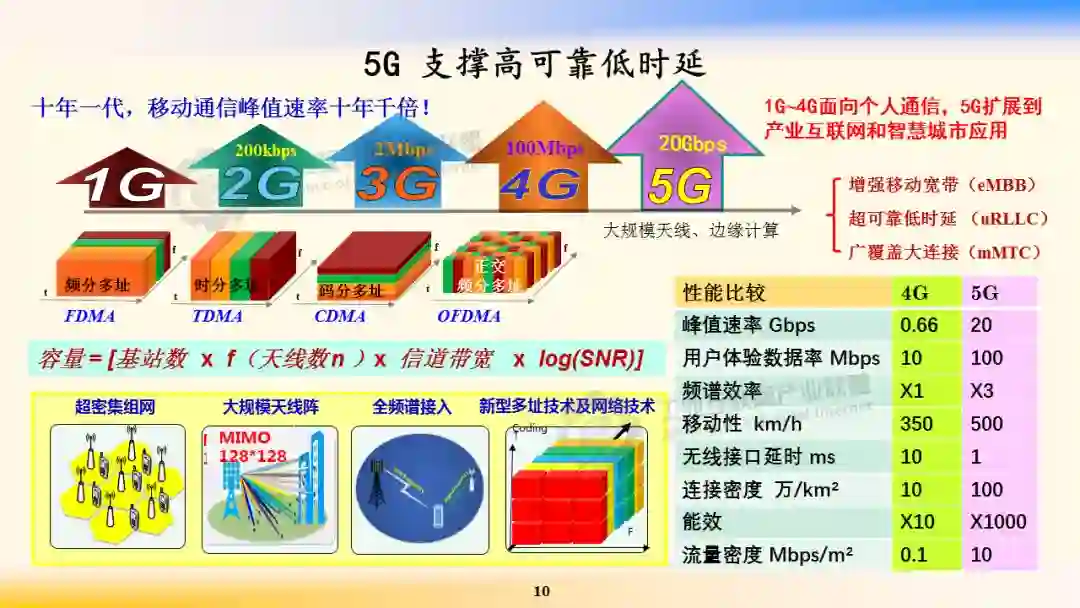 “ 5G怎么适应工业上的需求?从1-4G峰值速率在不断提升,更重要的5G来了,它改变了4G面向消费的应用规则,而5G则是面向智慧城市和产业互联网。针对工业互联网的要求,5G定位增长了高带宽、广覆盖、大连接、低时延,同时5G也促成了IT和OT的融合,5G成为数字经济的新引擎。”
