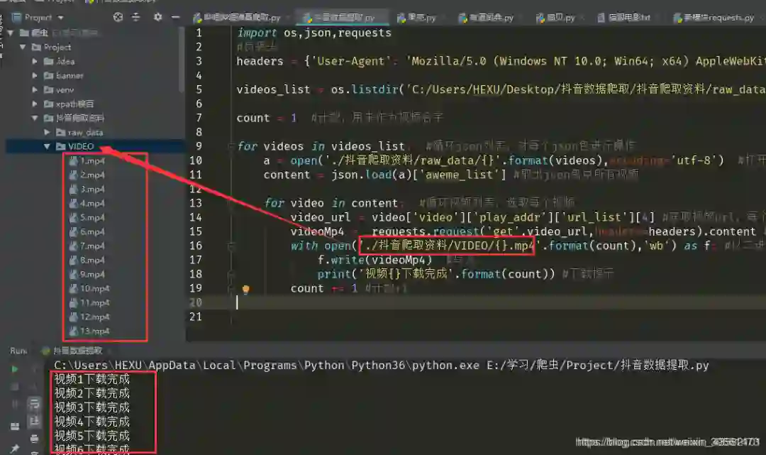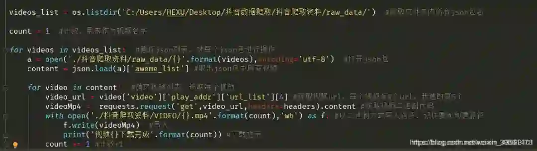 import os,json,requests#伪装头headers = {'User-Agent': 'Mozilla/5.0 (Windows NT 10.0; Win64; x64) AppleWebKit/537.36 (KHTML, like Gecko) Chrome/72.0.3626.119 Safari/537.36'}videos_list = os.listdir('C:/Users/HEXU/Desktop/抖音数据爬取/抖音爬取资料/raw_data/') #获取文件夹内所有json包名count = 1 #计数,用来作为视频名字for videos in videos_list: #循环json列表,对每个json包进行操作a = open('./抖音爬取资料/raw_data/{}'.format(videos),encoding='utf-8') #打开json包content = json.load(a)['aweme_list'] #取出json包中所有视频for video in content: #循环视频列表,选取每个视频video_url = video['video']['play_addr']['url_list'][4] #获取视频url,每个视频有6个url,我选的第5个videoMp4 = requests.request('get',video_url,headers=headers).content #获取视频二进制代码with open('./抖音爬取资料/VIDEO/{}.mp4'.format(count),'wb') as f: #以二进制方式写入路径,记住要先创建路径f.write(videoMp4) #写入print('视频{}下载完成'.format(count)) #下载提示count += 1 #计数+1