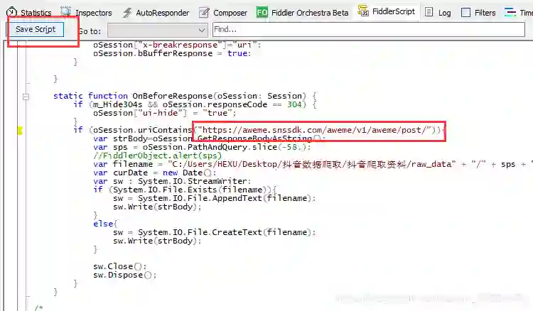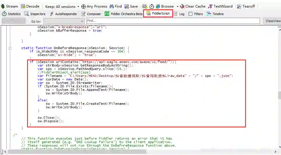所以我们使用fidder自带的脚本,在里面添加规则,当视频json包刷出来后自动保存json包。