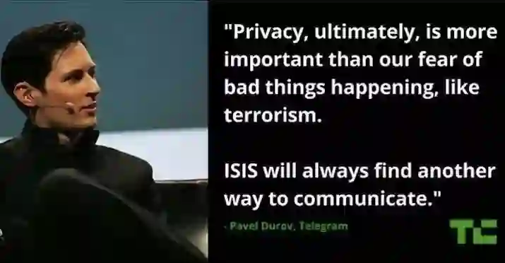 在 2015 年 TechCrunch Disrupt 旧金山大会的舞台上,杜罗夫承认了 ISIS 正在使用 Telegram,并跟主持人进行了以下的对话: