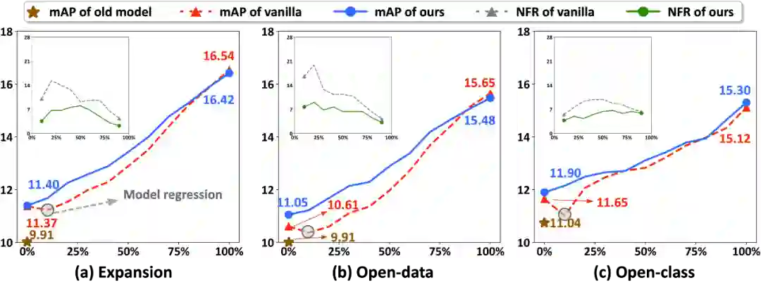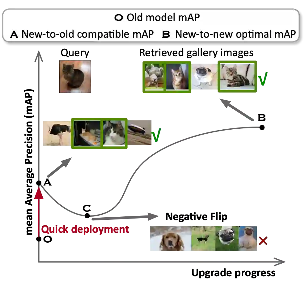 ,兼容学习 [1] 训练的新模型所提取的新特征由于可以与底库中的旧特征直接对比,所以无需特征回填便可即时部署上线新模型;同时,由于新特征与旧特征直接可比、可互换,所以在新模型部署上线后,可以利用新模型在线刷新底库特征,实现检索精度的逐步爬升,直至全部底库特征刷新完毕。