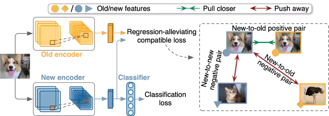 为了缓解热刷新模型升级过程中的模型退化问题,作者提出了一种简单有效的正则化,即约束新→旧正样本对距离不光要小于新→旧负样本对距离,也要小于新→新负样本对距离(过往兼容学习算法只约束了前者),并以对比学习的形式呈现。如下图所示,该正则化被称之为缓解退化的兼容损失函数,具体公式不在此呈现,感兴趣的读者可翻阅论文。
