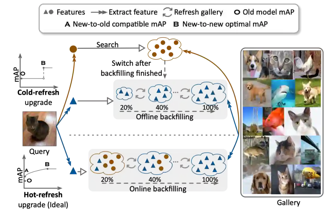 在传统的检索模型升级过程中,需要先用新模型离线刷新底库中的所有特征(称之为特征「回填」),再将新模型部署上线,这一过程被称之