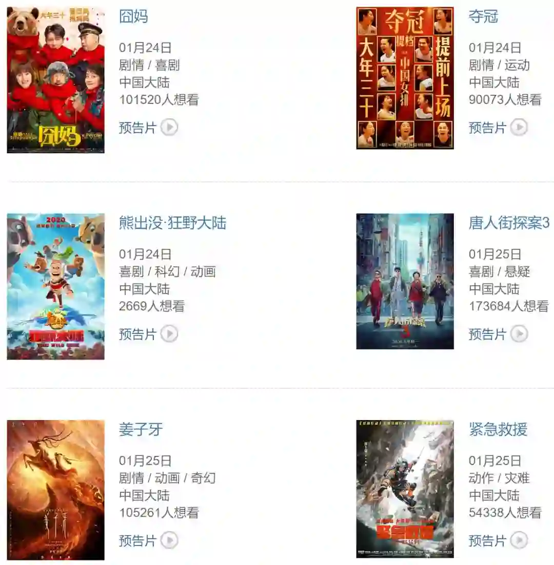 这也直接反映到了影视传媒的股价上。A股市场上,包括万达电影、华策影视、横店影视、光线传媒等在内的影视概念股集体下跌。今年有望冲击冠军的《唐探3》,其背后出品方就包括万达影业。为了应对包括疫情在内的不确定性,《囧妈》、《夺冠》、《熊出没》三部影片临时宣布提档至大年三十。