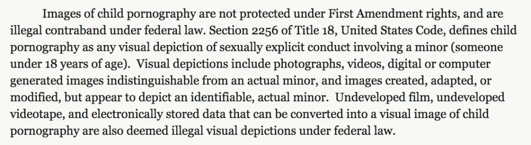 跟据美国司法部公布的相关法律条文,儿童色情观看者不受宪法第一修正案(信仰言论自由法案)的保护。而且任何以视觉形式呈现的或真实或合成或画出来的作品都属于儿童色情范畴。