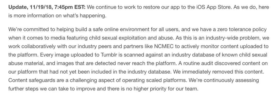 最初Tumblr只是说它“遇到了一些问题”,“正在积极解决”。然而随后 Tumblr 在网站公开的信息显示,这次应用被下架和儿童色情直接相关。