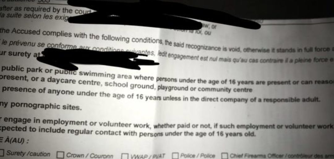 根据法院派发的行为限制令,在被保释之后,他不能再进入公园和游泳馆,不能参加任何有 16 岁以下未成年人参与的活动、工作,不能接近中小学,不能再浏览任何形式的色情网站。