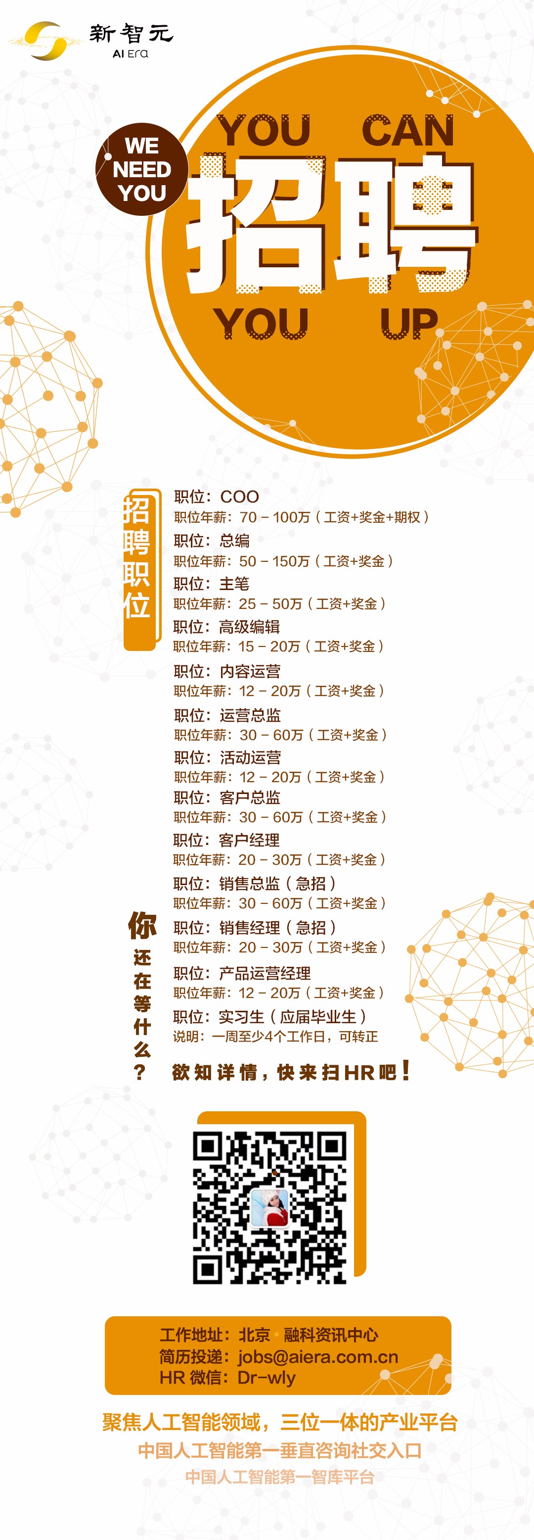 新智元AI技术+产业社群招募中,欢迎对AI技术+产业落地感兴趣的同学,加小助手微信号: aiera2015_1 入群;通过审核后我们将邀请进群,加入社群后务必修改群备注(姓名-公司-职位;专业群审核较严,敬请谅解)。