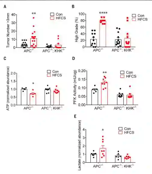 研究人员们使用了APC基因被敲除的早期结肠癌的小鼠模型,这些小鼠因为抑癌基因被毁,正常的肠道细胞开始无休止的生长,形成了早期结直肠癌。他们每天给这些小鼠喂食一定量的HFCS,同时对糖浆量严格控制,避免小鼠产生肥胖症状。结果表明,与对照组相比,摄入HFCS的小鼠体重与肠道肿瘤数目皆没有显著差异,但是肿瘤体积却明显增大!恶性程度也更高!这些就表明摄入HFCS即使不造成机体肥胖,也可以很大程度促进结直肠癌瘤体的生长和恶化!