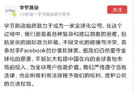 【字节跳动官方发声:Facebook抄袭和抹黑】8月3日凌晨,字节跳动官方账号在头条号上回应美国总统特朗普对TikTok的“封杀令”,其称,字节跳动始终致力于成为一家全球化公司。在这个过程中,我们面临着各种复杂和难以想象的困难,包括紧张的国际政治环境、不同文化的碰撞与冲突、竞争对手Facebook的抄袭和抹黑。但我们仍然坚守全球化的愿景,不断加大包括中国在内的全球各地市场的投入,为全球用户创造价值。我们严格遵守当地法律,也会积极利用法律授予我们的权利,维护公司的合法权益。
