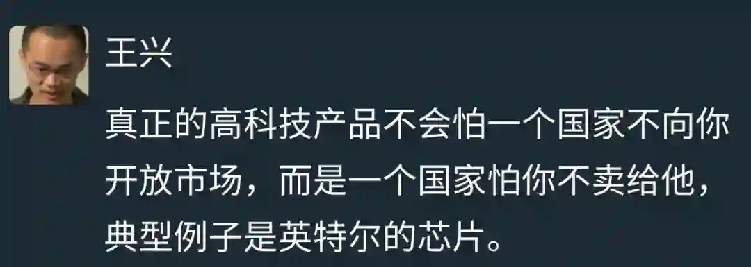 【王兴:真正的高科技产品不会怕一个国家不向】8月2日晚,美团王兴在公众平台上发表言论,表示:真正的高科技产品不会怕一个国家不向你开放市场,而是一个国家怕你不卖给他,典型例子是英特尔的芯片。