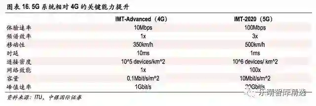 5G标准还将大幅提升网络性能,深入挖掘频谱效率或拓展可用频段。预计5G系统基带整体频谱效率将提升3倍。而5G系统带宽的定义也自LTE阶段的20M扩大到了500M,可以整合利用的系统带宽整整扩大了25倍。