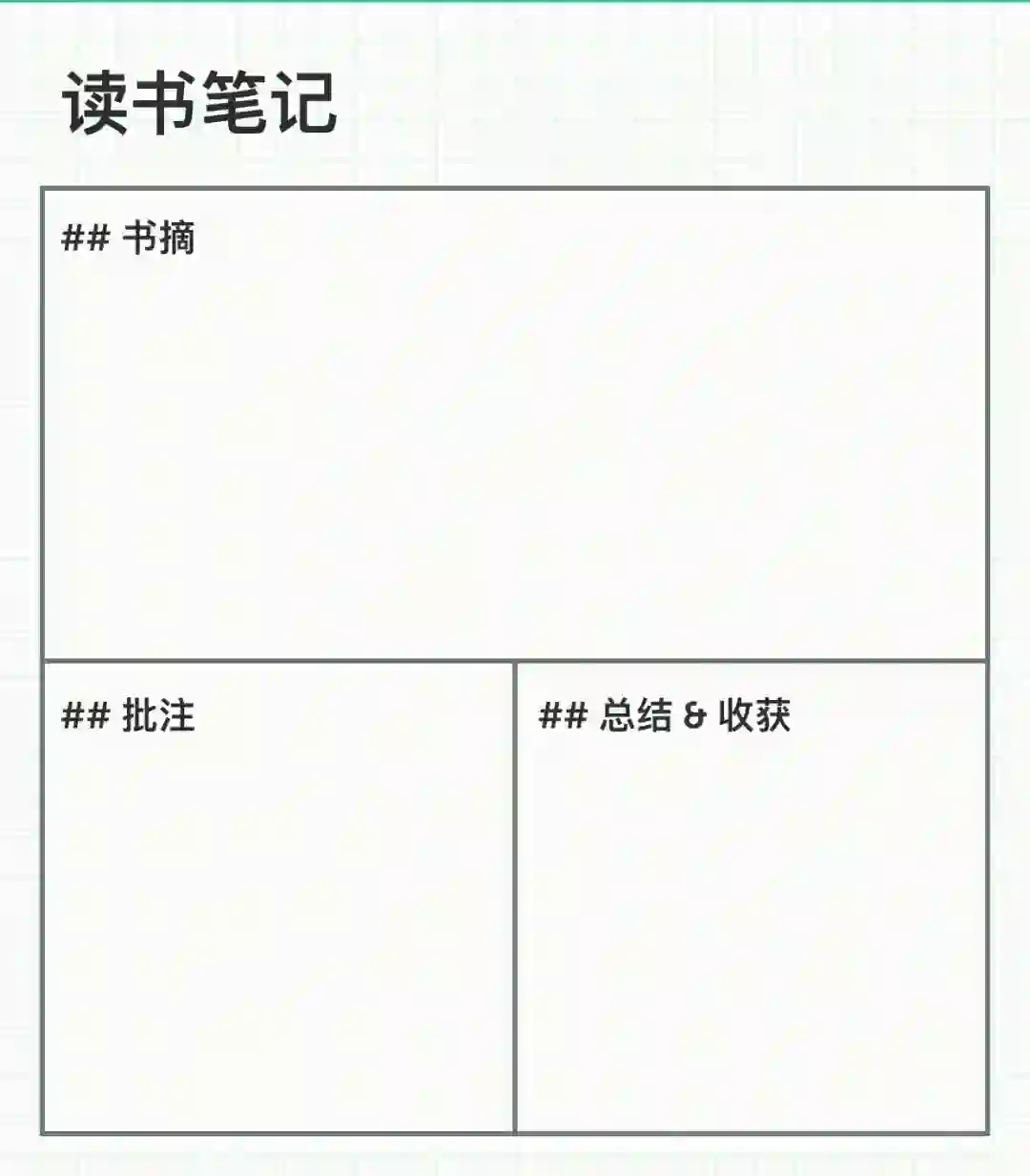 读书笔记主要分为上下 2 块,上面是书摘,也就是摘抄书内的内容,下面分为批注和总结2部分,批注是指阅读的时候把读书感想、疑难问题,随手批写在书中的空白地方,以帮助理解,深入思考。总结与收获是将批注的内容额外进行整理,再度进行深入的思考。