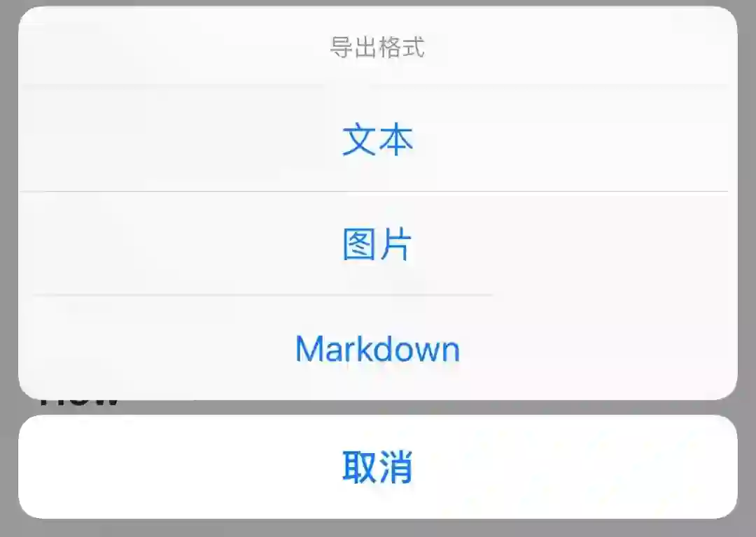 此外最右侧的的导出按钮,可以导出纯文本格式,图片和 Markdown格式,然后通过 Share Sheet 分享出去。
