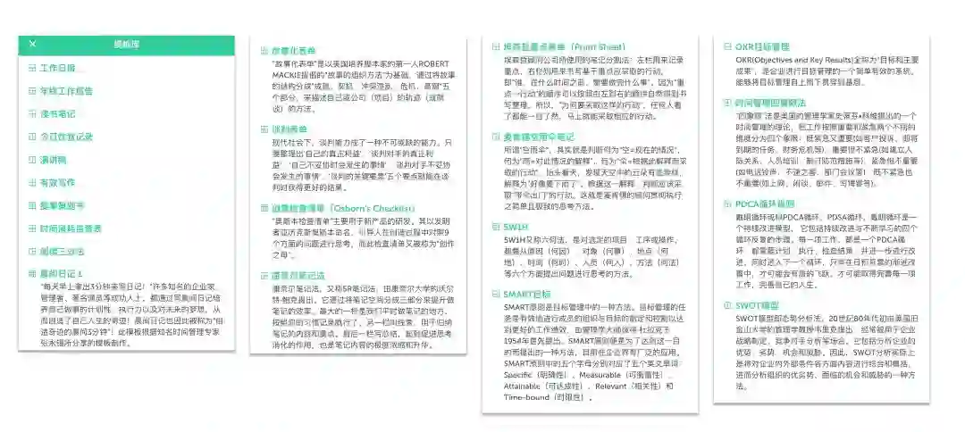 当然,整个软件中最重要的就是模板系统了。模板系统其实就是格子布局在实际应用中的最常用的几个形象。不仅包括了 5W1H、SWOT 这样很多人都耳熟能详的经典格子使用方式,还包括了很多在纸质笔记本中常用的记录方式,比如康奈尔笔记法,空雨伞笔记法。和其他更加特殊的笔记记录方式。每个模板下面都有非常详细的介绍和使用说明,方便用户获取和使用。