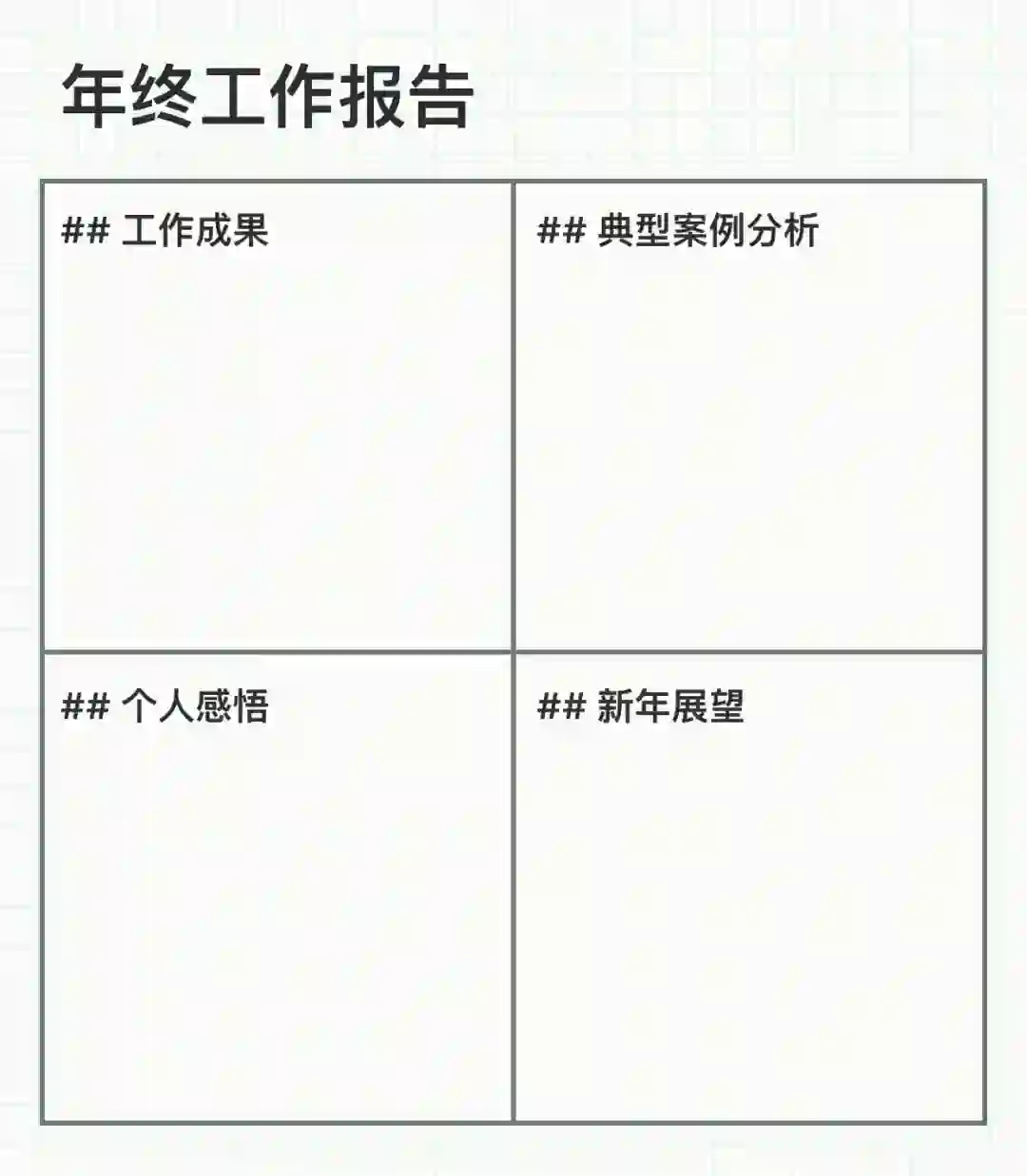 又到了年末,该到写年度工作报告的时候了,相信不少人完全没有下笔的动力,我相信很大程度上是因为不知道从哪里开始,而格子笔记提供的年度工作报告,通过 工作成果,典型案例分析,个人感悟,新年展望,从过去的案例开始一直到对新年的展望,方便在年末的时候进行回顾。