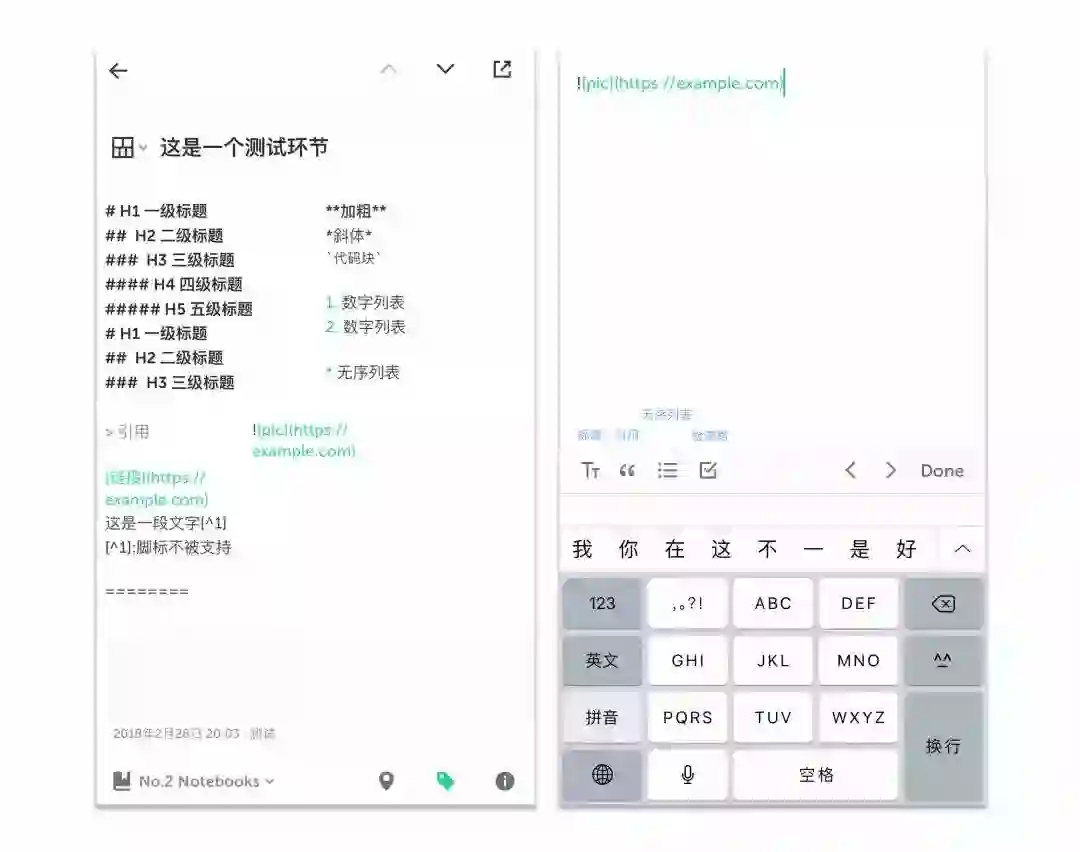 移动端做笔记很大程度上,需要的是快速输入,因此 Markdown 语法的支持非常重要,格子笔记支持完整的 Mardown 语法,且常用的语法已经放置在左下角,右下角则是前后切换所编辑格子的快捷选项。